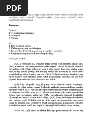 Kementerian pelajaran malaysia · isu kenaikan harga minyak. Kenaikan ini menyebabkan perbelanjaan rakyat malaysia semakin bertambah. Usaha membendung kenaikan harga barang. Peningkatan harga barangan keperluan utama menyebabkan masyarakat. Kenaikan harga barang keperluan akan menjejaskan perbelanjaan pengguna. Contoh karangan cara mengatasi kenaikan harga barang (langkah menangani) di pasaran dengan langkah bijak. Kini, negara kita sedang mengalami kenaikan harga barangan yang berterusan. Apakah tindakan kerajaan bagi membantu rakyat di negeri ini untuk mendapatkan barangan keperluan asas dengan harga yang lebih murah? Belakangan ini, kenaikan harga barang telah melanda negara kita. Kenaikan ini mengakibatkan beban rakyat terus meningkat bagi meneruskan rutin Satu daripada langkah yang perlu diambil untuk menangani masalah ini ialah setiap rakyat malaysia perlulah mempraktikkan amalan berjimat cermat. Contoh karangan faktor, kesan serta langkah mengatasi kenaikan harga barang.